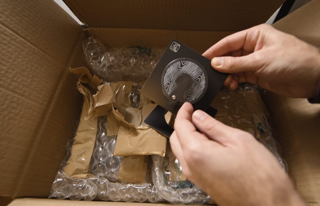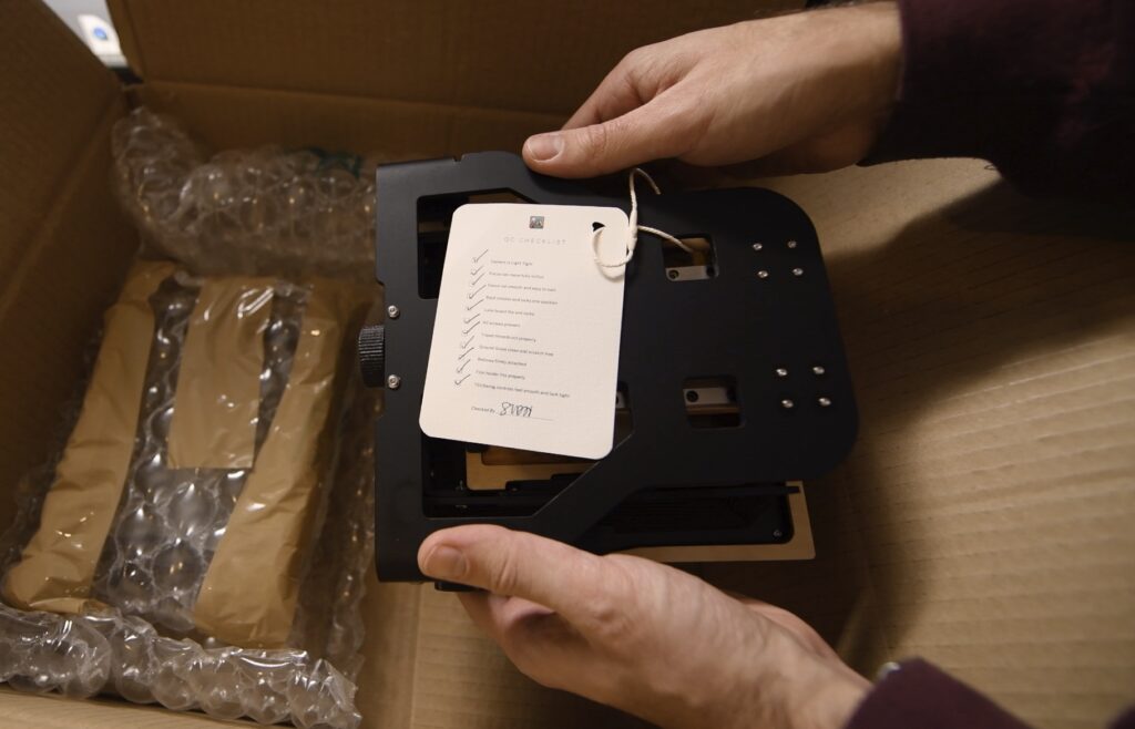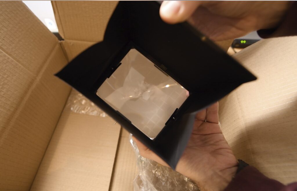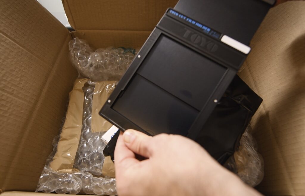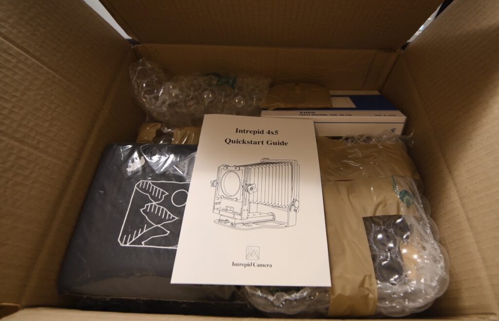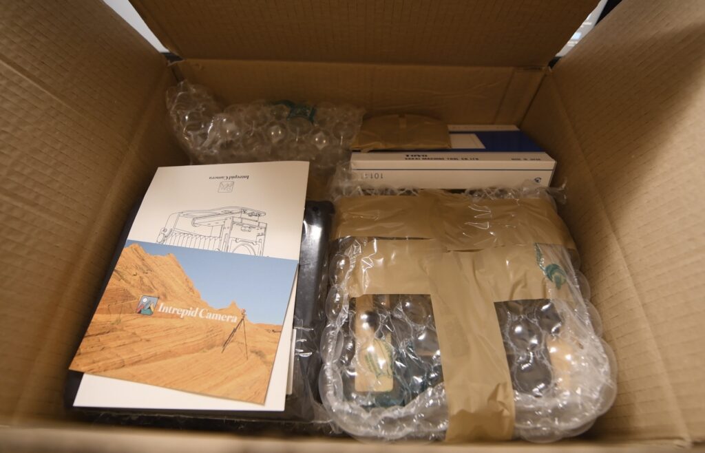 Cartão-postal, manual, porta-filme e câmara.Capa do manual com o paninho de transporte à esquerda.Lente pinhole ou estenopeica (Wikipedia!)Porta filmeCâmaraFresnel com sombrinha
