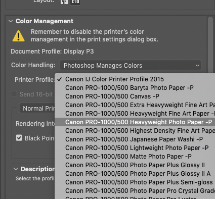 - Use black point compensation: faz com que a cor mais escura da sua foto coincida com a cor mais escura que a combinação entre a tinta e o papel podem produzir, e ajusta os tons próximos proporcionalmente. Experimente usando um papel pequeno antes de fazer grandes impressões pois pode causar grande diferença. Eu uso esse modo em fotos que tem bastante detalhe em áreas escura.