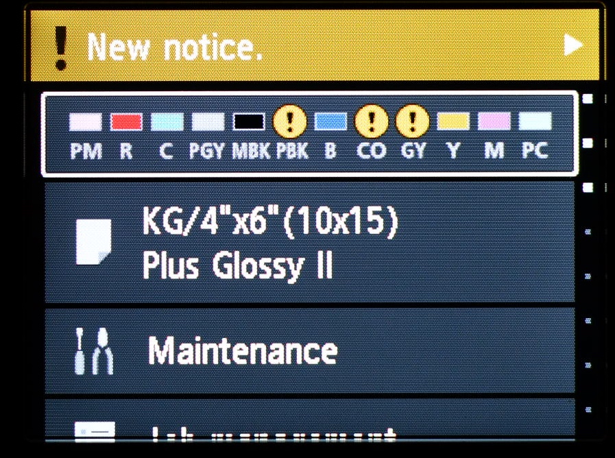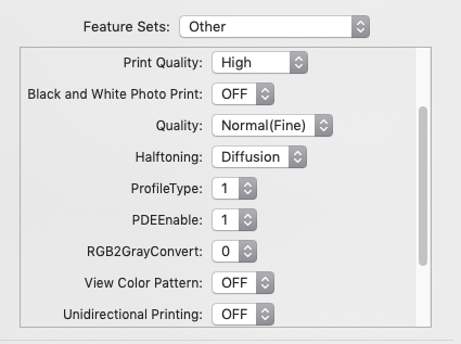 - Clear coating: a impressora joga verniz nas fotos brilhantes (Chroma Optimiser) para evitar variação nas cores quando vista de certos ângulos. Por padrão, a impressora não enverniza áreas mais claras da imagem, economizando um pouco de CO. A diferença é pouca, mas é notável quando vista de ângulos maiores. Escolhendo Overall, a impressora vai jogar CO no papel todo.