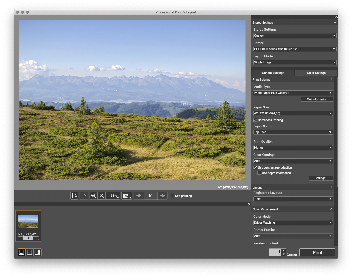 Mesmo quando pronta, ela demora a começar a imprimir, dependendo do tamanho do arquivo a ser enviado para a impressora ou das opções escolhidas no Professional Print & Layout. Por exemplo, escolher a opção “Use contrast reproduction”, fará o seu computador usar 100% de um núcleo por alguns minutos, dependendo da resolução da foto original, para só depois enviar o arquivo processado para a impressora.