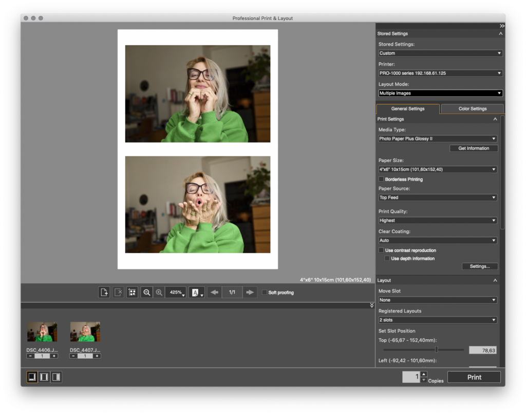 Ainda bem que a Canon inclui o excelente Professional Print & Layout. Eu segui as instruções direitinho e só perdi uma foto até hoje (porque eu coloquei o papel do lado errado).