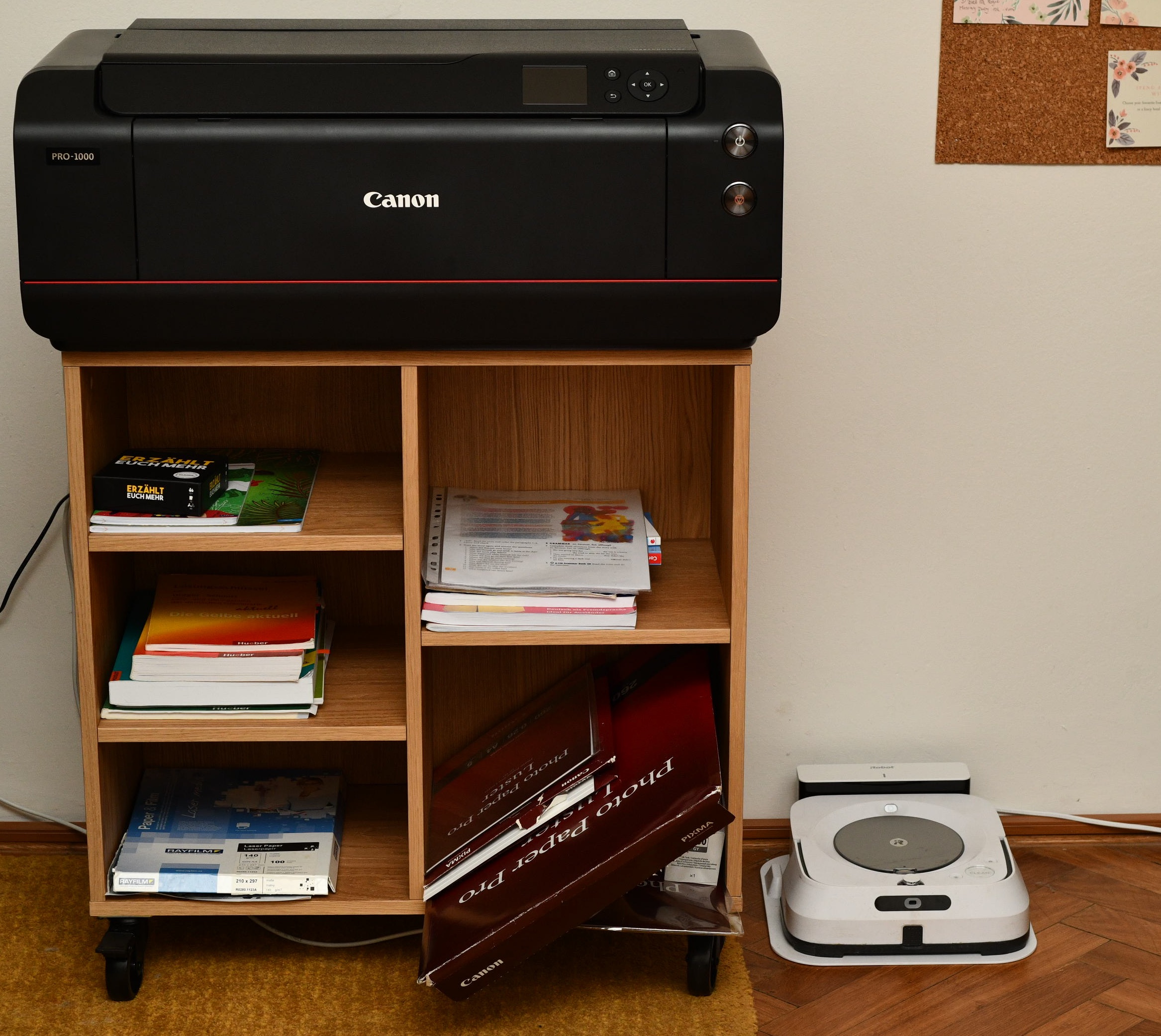 Não é uma impressora para quem mora em um lugar pequeno. Você precisa de espaço tanto para desembalá-la, quanto para sua operação. Comprei uma mesa com rodinhas e prateleiras para poder arrastá-la para fora do escritório na hora da faxina e para ter onde guardar suprimentos e papéis. Desligá-la da tomada faz com que reinicie, desperdiçando tinta. Portanto, vive conectada a um no-break.