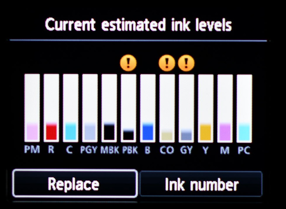A Canon vende kits com todos os cartuchos por 700 dólares nos Estados Unidos. Mas, como você pode ver, o kit não faz sentido algum. Uma boa estratégia é comprar um cartucho novo assim que o aviso de tinta baixa aparecer e ir trocando os cartuchos um a um. A minha meta de longo prazo é sempre ter um jogo de tinta no estoque. No Mercado Livre, cada cartucho sai entre 500 e 600 reais. Jogando a média, sai R$ 6.600,00 abastecer essa belezura. Custa mais que andar de Opala.