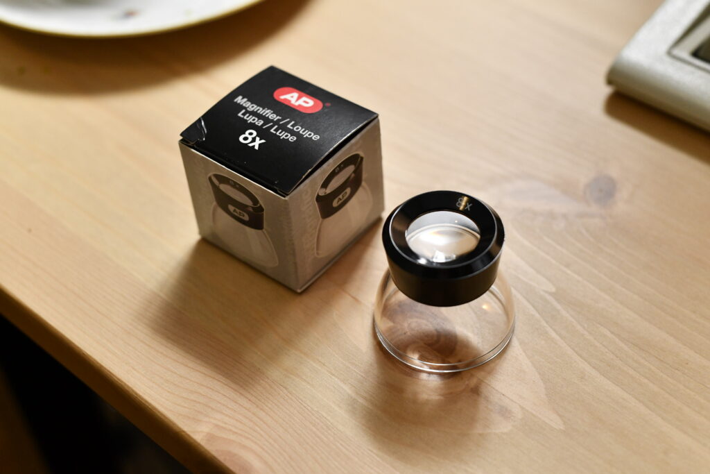 A lupa de foco é essencial para acertar o foco quando tirando foto de detalhes. A profundidade de campo tende a ser reduzida e às vezes é difícil acertar sem ajuda da lupa. Escolhi uma lupa AP 8x, de fabricação espanhola.