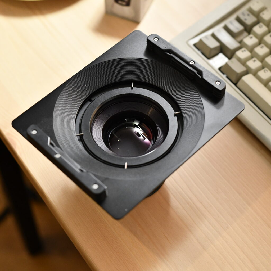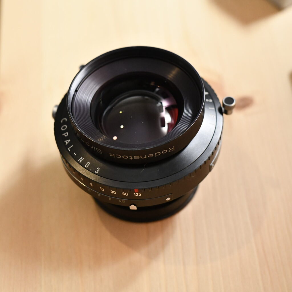 A lente é uma Rodenstock Sironar-N 240mm f/5.6. Eu admito a minha ignorância completa, então fui pelo básico. Escolhi uma lente que eu conseguiria usar em uma máquina 8×10 (que é o objetivo final), mas que também funcionaria na máquina que eu escolhi. Eu não sei se conseguirei focalizar muito perto, porque para focalizar no infinito com uma lente 240mm, eu preciso de 240mm de fole, e a Intrepid 4×5 tem 300mm de fole. Não podemos esquecer que uma lente 240mm em 4×5 é equivalente a uma 68mm em 35mm e 45mm em um sensor crop.
