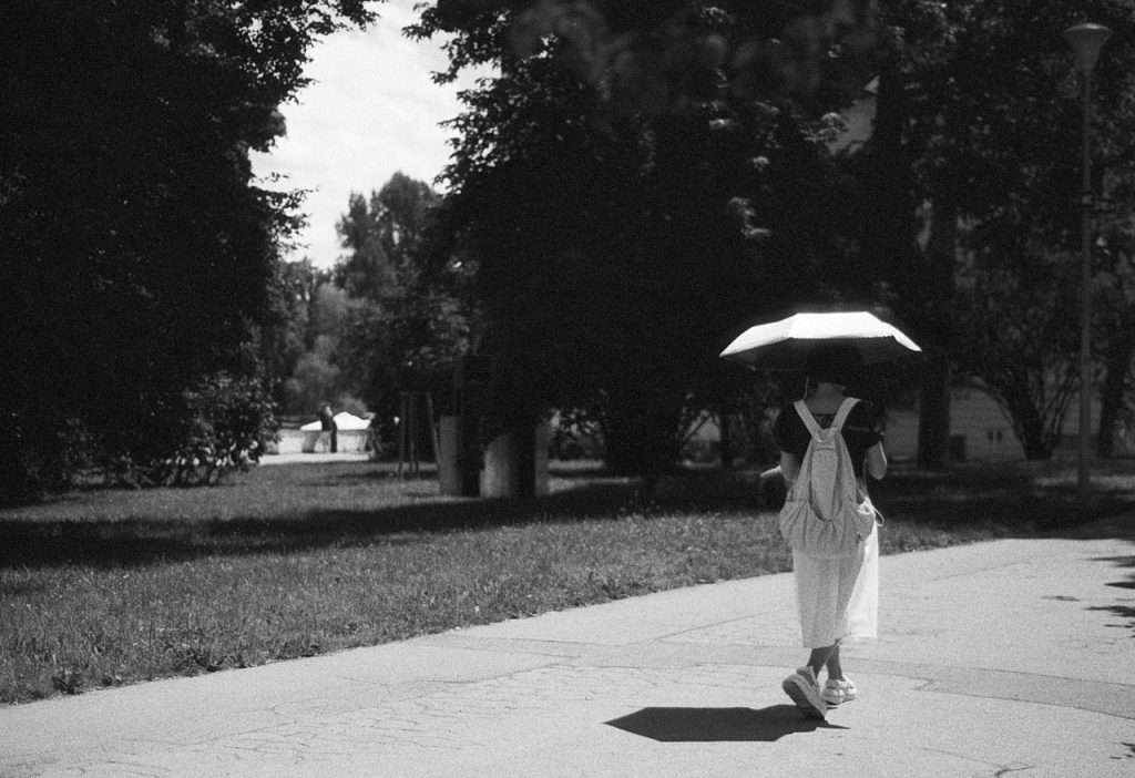 Copyright © 2024 Saulo Paiva – Fotografia de rua não é a minha especialidade. Segui esta moça de sombrinha branca por uns 150 metros até achar uma posição boa para fotografá-la. A Nikon F6 ajudou: exposição perfeita e foco rápido. Coloquei a máquina em modo de foco contínuo e modo P ajustado para maior velocidade. Não levei mais de meio segundo entre levantar a câmara, tirar a foto e soltá-la no ombro.