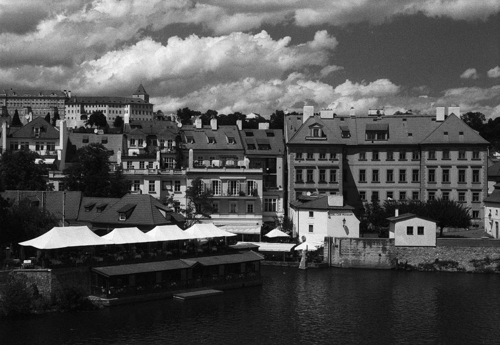 Copyright © 2024 Saulo Paiva – Vista clichê de Praga com polarizador. As regiões de tom uniforme, como o céu, sofrem mais com a granulação clássica do filme, mas os telhados e texto escrito retém detalhe que não perdem nada para uma máquina de até 24 megapixels.